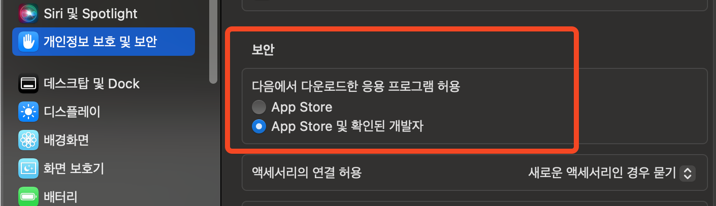 1. 시스템 설정 > 개인정보 보호 및 보안 탭 확인