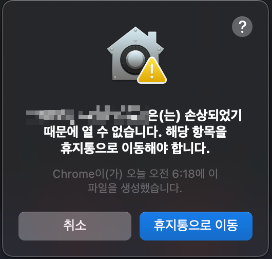 확인되지 않은 개발자 혹은 정상적인 경로를 통해 다운받은 설치파일이 아니라면 이렇게 "~은(는) 손상되었기 때문에 열 수 없습니다. ~" 라고 뜬다.
